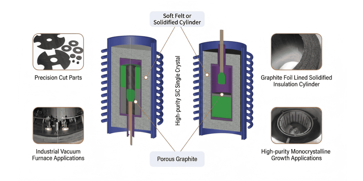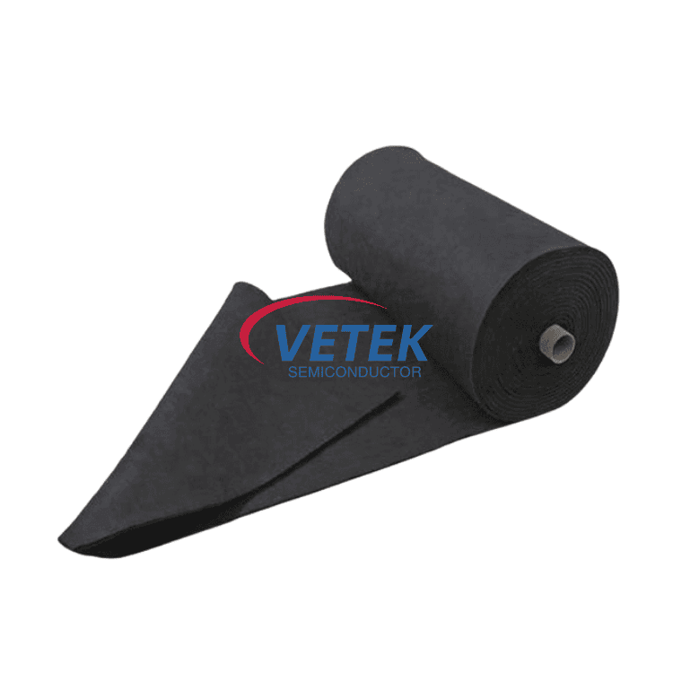 索引 ユニット 標準 高純度 厚さ mm 10/5 10/5 密度 g/cm3 0.08~0.1 0.08~0.1 幅 mm 1200~1400 1200~1400 灰分含有量 ppm < 200 < 20 導電率 W/m・K 0.1~0.13 0.1~0.13 黒鉛化 ℃ > 2200 > 2200 3. アプリケーション 半導体製造:これは、単結晶シリコンおよび SiC 結晶成長炉のセットアップにとって重要な絶縁層です。 光ファイバー通信:焼結炉、引抜塔、高温ロッド製造での使用に最適です。 高度な研究:サファイア成長炉と特殊な高温精製システムで信頼されています。 4. VETEK を選ぶ理由? より高速なスループット:低比熱材料を利用することで、熱サイクルが大幅に高速化され、これにより毎日のスループットが直接的に増加します。 信頼性の高いシールド:当社の生産は厳密な繊維密度管理に重点を置いています。弱い部分を排除するので、チャンバー全体にわたって信頼性の高いシールドが得られます。 HPSI規格:HPSI および RF プロセス向けに、当社の高純度標準は、これらの敏感な高抵抗率の要件に対処できるように特別に設計されています。 簡単な取り付け:この材料はもともと柔軟性があるため、複雑な形状に合わせて精密にカットすることができ、設置プロセス全体を簡素化するのに非常に役立ちます。